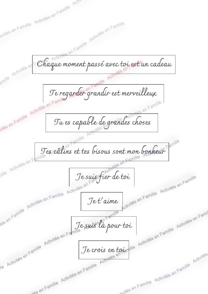 – Ils entendront de la part de leur parents des mots doux qu’ils auront préalablement collés sur la fiche concernée ; de cette façon lorsque les parents découvriront cette page, ils pourront lui murmurer toutes ces phrases bienveillantes et remplies d’amour.